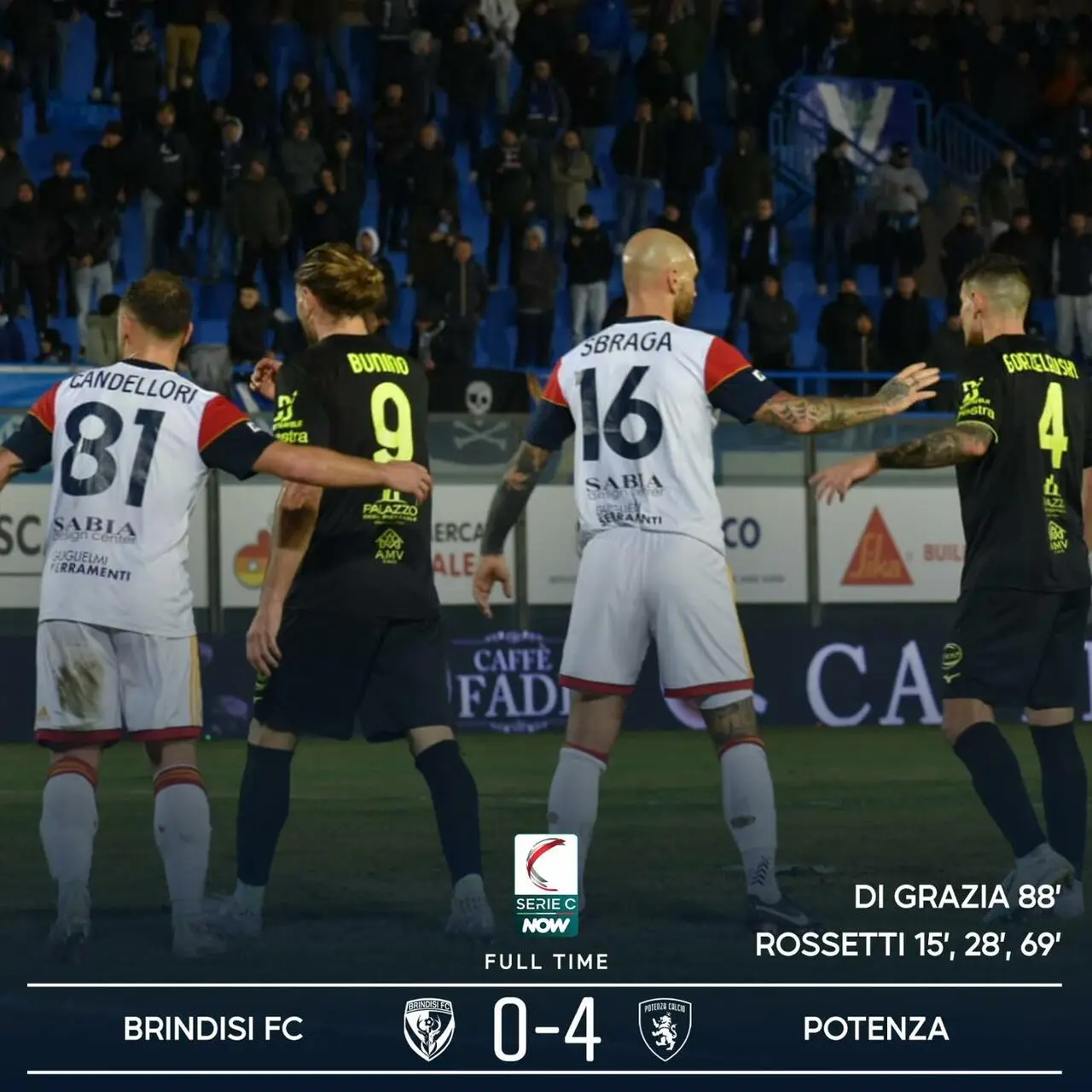 Si è conclusa la sfida tra Brindisi e Potenza con la vittoria degli ospiti per 4-0. Decisiva la tripletta di Rossetti che ha indirizzato l'incontro e ha fatto esordire con una vittoria il neo-tecnico Marchionni: nel finale, il rigore di Di Grazia ha addolcito il punteggio per i suoi. Continua il periodo negativo dei pugliesi, al momento penultimi in classifica.